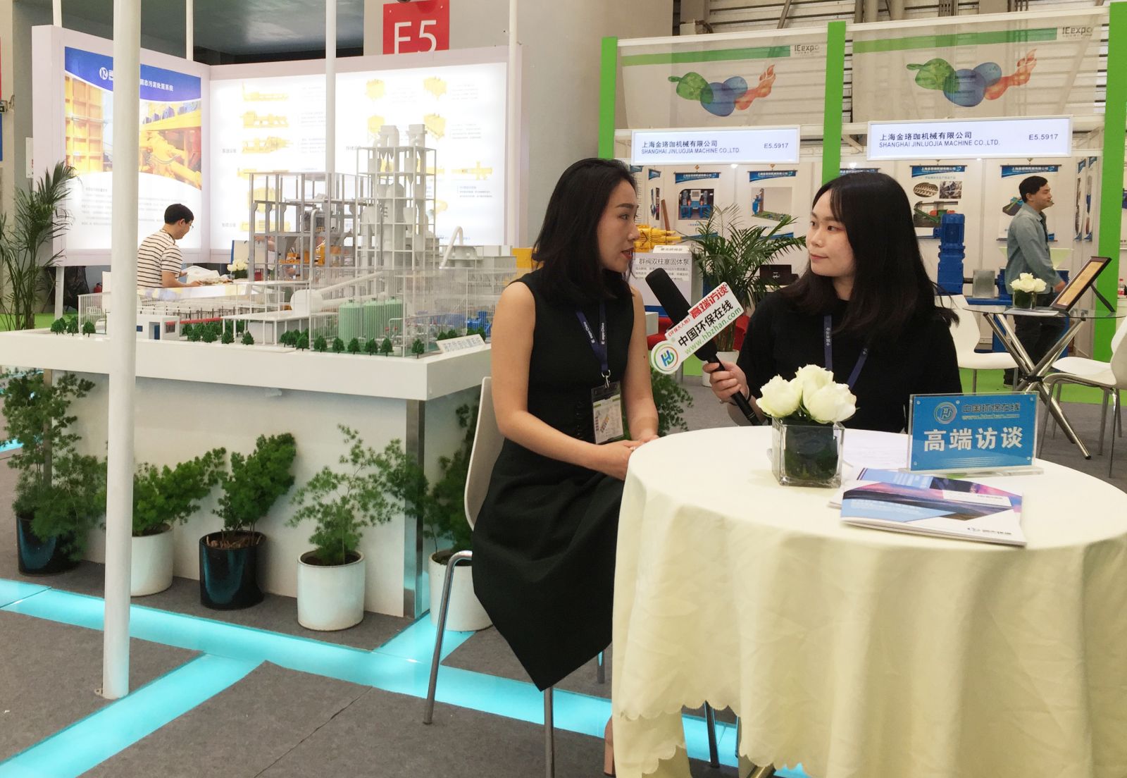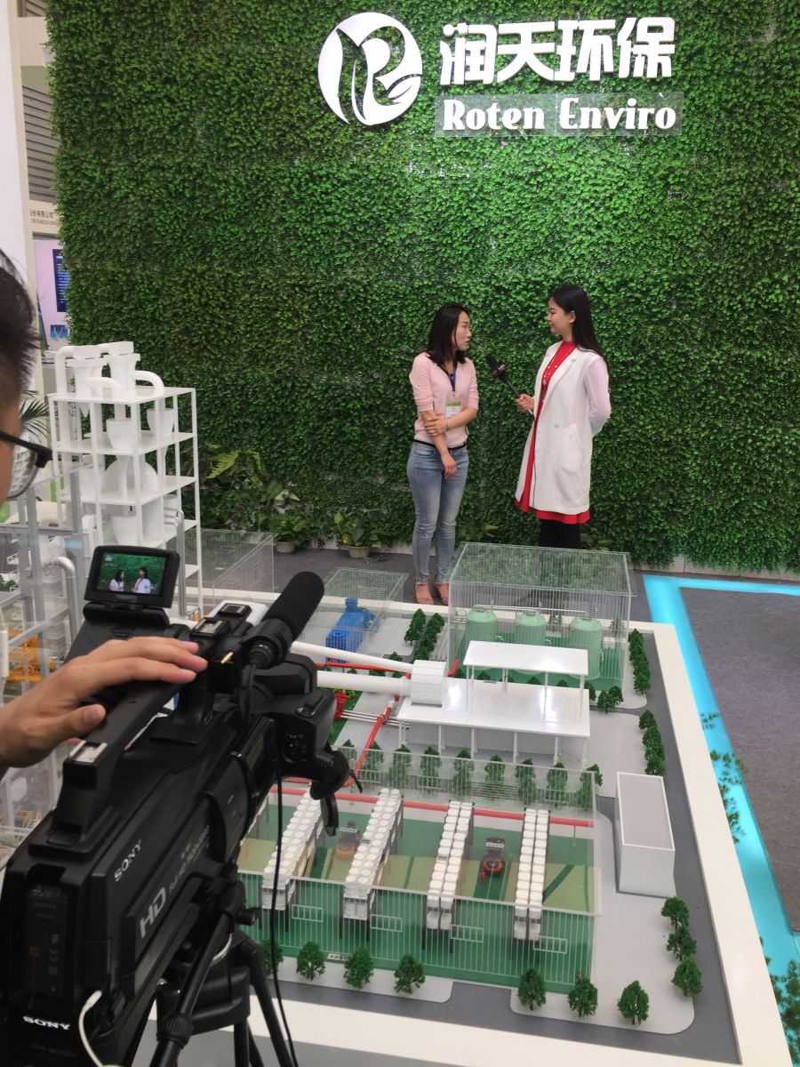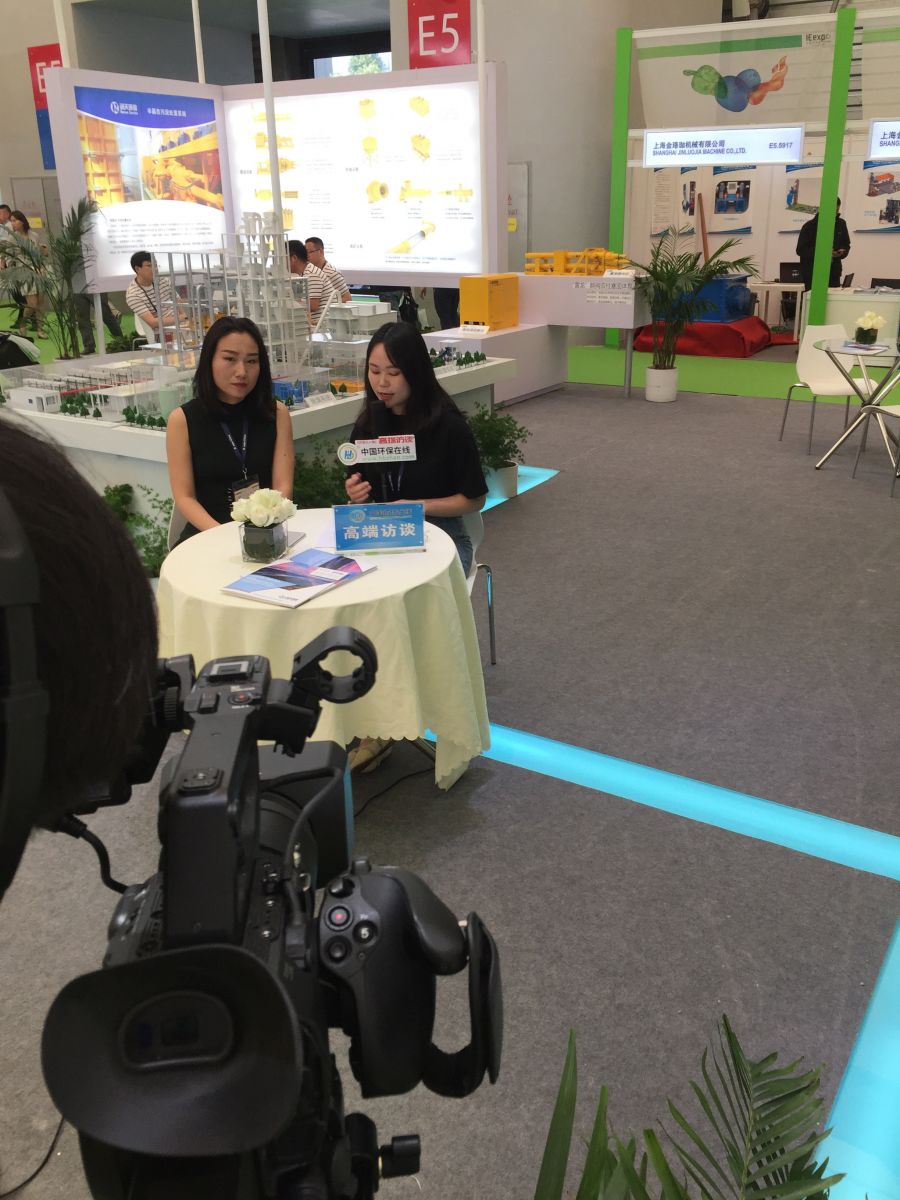 【上圖】在第十九屆中國環博會潤天展廳,包括中國環保在線《高端訪談》欄目在內的等多家重量級行業媒體,紛紛聚焦潤天環保。圖為潤天執行董事董婧祎女士(左)接受采訪。