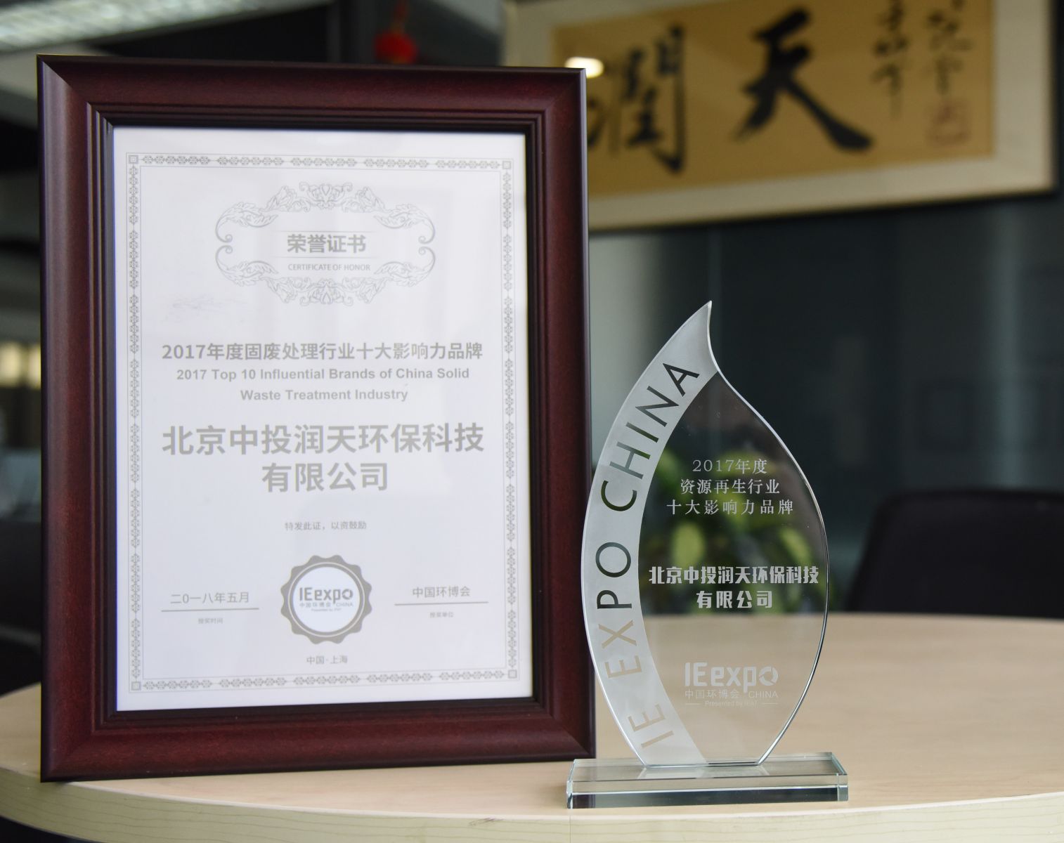 【下圖】在本屆中國環博會上,北京中投潤天環保科技有限公司獲選為“中國固廢處理行業十大影響力品牌”。