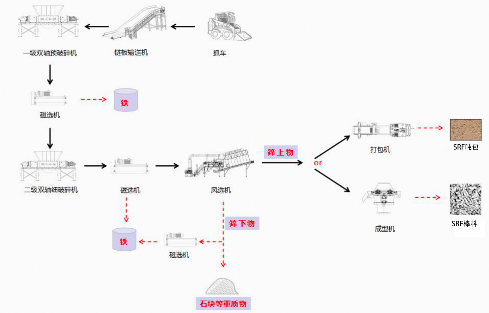 本工藝通過破碎、分選、成型等工序將一般工業固廢加工成SRF,作為替代燃料供應水泥、鋼鐵、發電等高耗能工業。在垃圾能源化的同時促進煤炭替代,節能減排,助力雙碳目標,實現工業綠色發展。本工藝滿足 12-15t/h 的生產能力,主要用于廢舊紡織布條、皮革、塑料 等物料,經過二級破碎后出料粒徑 90%≤80mm,偶有長條,經成型機后成 SRF 棒料。