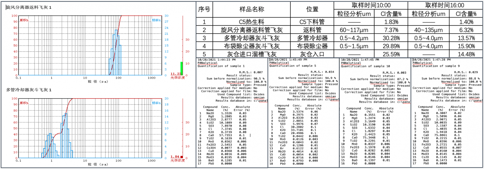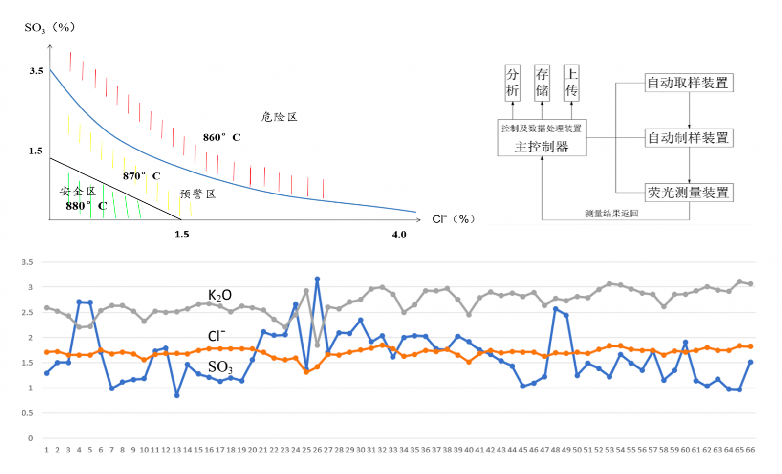 自動采樣單元1次/小時對水泥窯尾熱生料進行自動采集,并自動將樣品送入檢測儀器,對S、Cl、 K有害元素含量進行檢測。分析系統將根據有害元素含量變化自動控制除氯系統開關,在窯尾氯含量下降到安全區后,高效除氯系統自動關閉,避免無效除氯,保證除氯灰高濃度,更智能更節能。